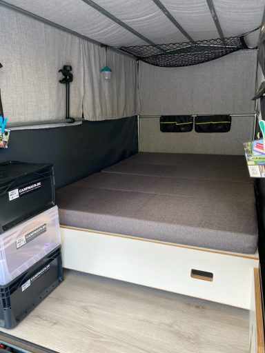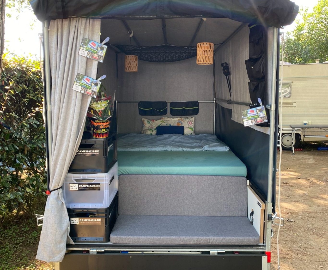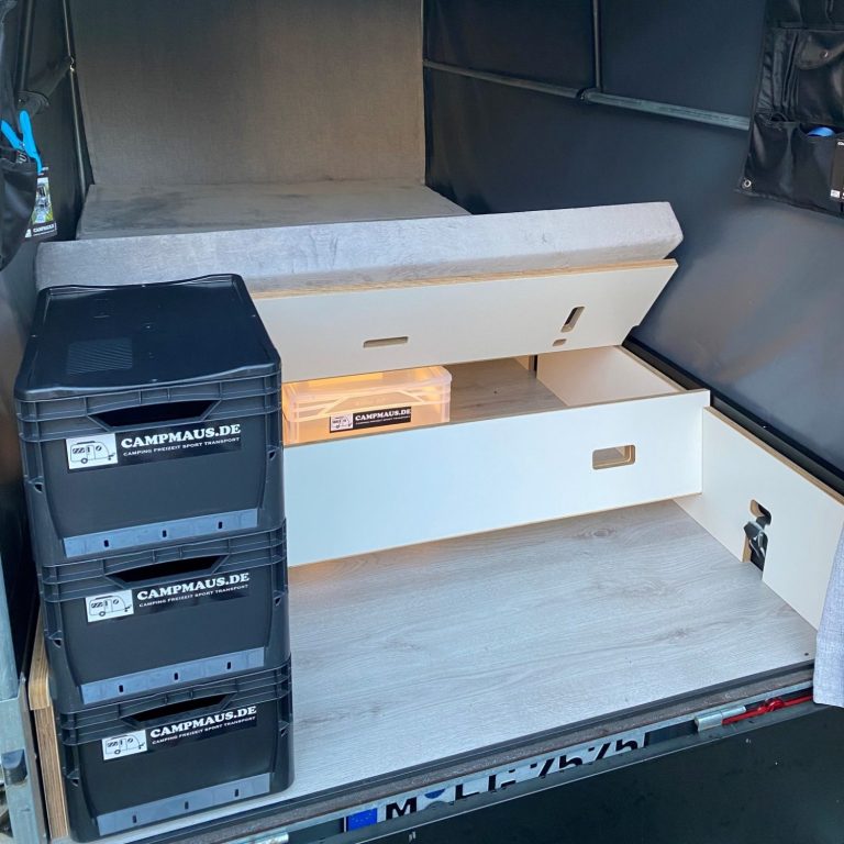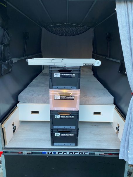 Speziell für Wohnmobile bietet sich die campmaus als "Begleitfahrzeug" an. So entsteht nicht nur ein zusätzlicher Schlafraum für die flügge gewordenen Kinder, auch die Mitnahme von weiteren Dingen, wie z.B. SUP, Motorschlauchboot usw. ist möglich, schließlich wird die Zuladung des Wohnmobils nicht belastet.