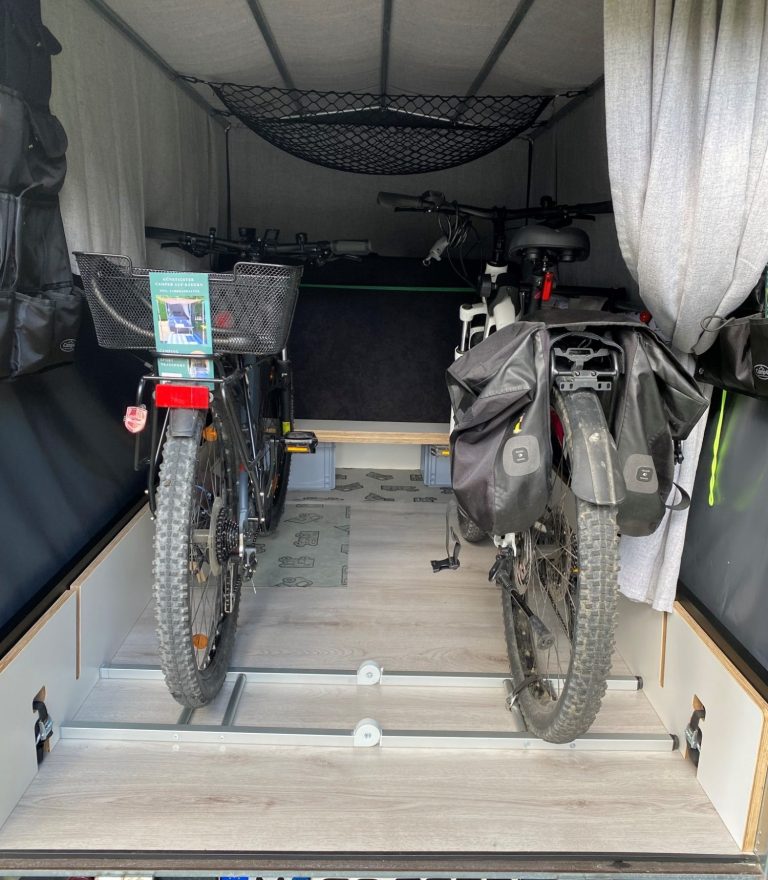 Einen Fahrradträger brauchst Du nicht extra, in unserem gebrauchsmustergeschütztem Campermodul ist dieser bereits für 2 Fahrräder enthalten.